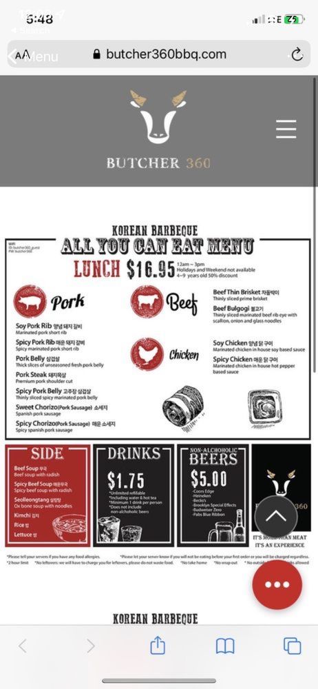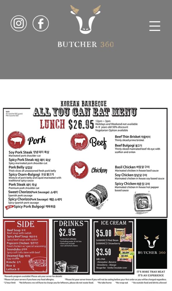 Introducing the menu at Butcher 360, a Korean BBQ restaurant in North Brunswick, NJ, offers a unique dining experience with a modern BBQ vibe. The menu includes a variety of options such as beef bulgogi, beef soup, garlic galbi, butcher 360 steak, soy squid, spicy pork steak, and more. The all-you-can-eat concept allows customers to enjoy a wide selection of fresh meats cooked to perfection right in front of them. The restaurant also offers a range of delicious sides like kimchi, pickled radish wraps, steamed egg, and more. With a lively atmosphere and friendly staff, Butcher 360 is the perfect spot for a group dinner or special occasion. Don't miss out on trying their signature dishes like Butcher 360, pork bulgogi, spicy sausage, and garlic galbi for a truly unforgettable culinary experience.
